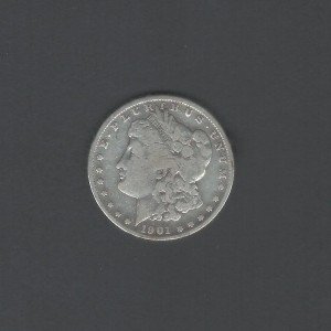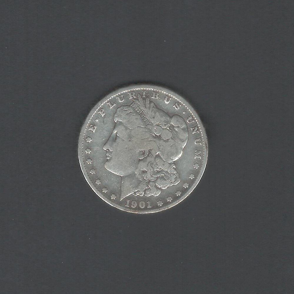 The obverse side of the coin features a left-facing portrait of Lady Liberty, with the word "Liberty" inscribed above her head and the year "1901" below. The reverse side of the coin showcases a bald eagle with its wings spread, clutching arrows and an olive branch. The words "United States of America" and "One Dollar" are inscribed on this side of the coin as well.
