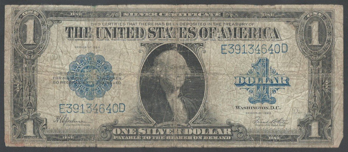 This silver certificate has a blue seal and serial numbers, with intricate engravings and designs on both sides. The back of the note showcases a vignette of the Great Seal of the United States, surrounded by intricate patterns. These 1923 $1 large-size banknotes were issued in response to the increasing demand for currency during the early 20th century, as the population and economy continued to grow.