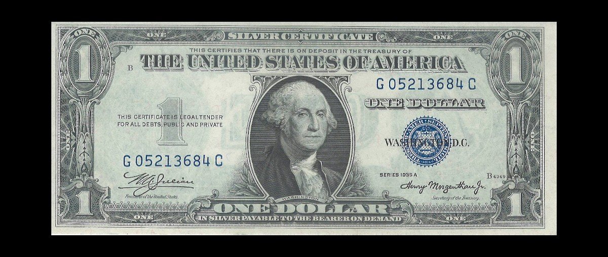 Silver certificates were issued from 1878 to 1964 and were backed by silver. They could be exchanged for their face value in silver coins or bullion. This particular note was issued in 1935 and has a blue seal and serial numbers. It is a one dollar denomination, which was the most common denomination for silver certificates at the time. The note has highly detailed and intricate engravings on both sides, showcasing the artistry and craftsmanship of the time.