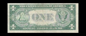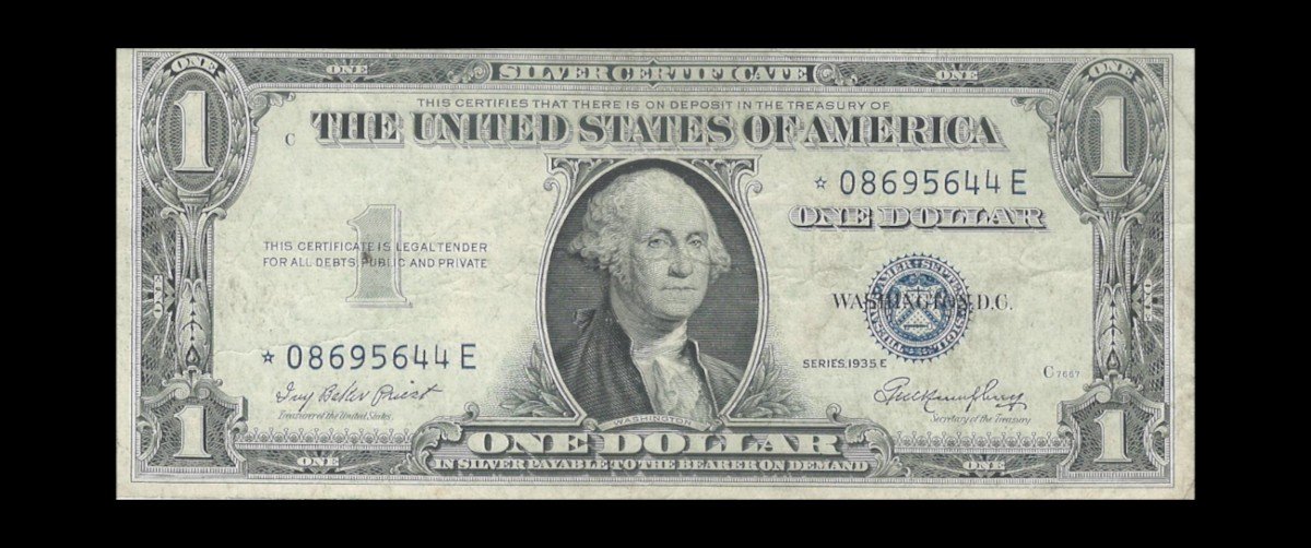 On the front of the 1935 E $1 Silver Certificate, a portrait of George Washington, the first President of the United States, stands out. The note also showcases the familiar blue seal and serial numbers, which are now accompanied by the additional star symbol. The back of the bill depicts a detailed design of the Great Seal of the United States, with an eagle and shield at the center.