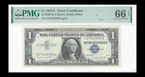 This listing features a 1957 silver certificate with a face value of $1. The note is graded 66 EPQ (Exceptional Paper Quality) and is considered a Crisp Gem UNC (Uncirculated) condition. The obverse of the bill shows a detailed portrait of George Washington, the first President of the United States. The certificate's blue seal and serial numbers are still vibrant and crisp, adding to its overall appeal.