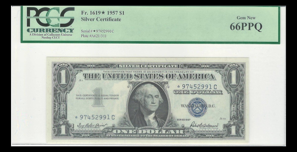 Rated as 66PPQ, this is considered a high-grade example with no major flaws or imperfections. The GEM UNC New designation signifies that this note is in crisp, uncirculated condition, ensuring its value as a sought-after collectible. Whether you're a currency enthusiast or a history buff, this 1957 A $1 Silver Certificate STAR 66PPQ GEM UNC New G. Washington Note is a captivating piece of American history that would make a valuable addition to any collection.
