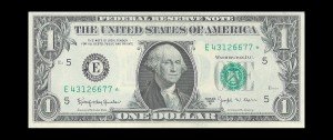 This particular note features a crisp, uncirculated condition, meaning it has never been used in everyday transactions and maintains its original appearance. The portrait of George Washington, the first president of the United States, can be seen on the front of the note, surrounded by decorative elements and the denomination "One Dollar". The back of the note displays an image of the Great Seal of the United States, completing the patriotic design of this historic piece of currency.
