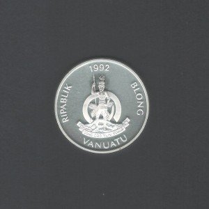 On the obverse side of the coin, the emblem of Vanuatu can be seen, featuring a Melanesian warrior with a spear and a traditional headdress. The intricate details on the warrior's attire highlight the country's rich cultural heritage.
