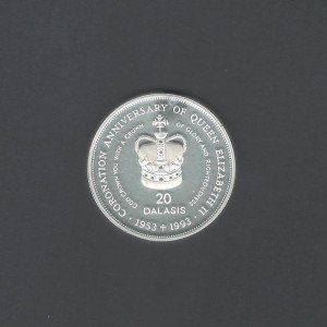 The 1993 40th Anniversary of Coronation Gambia 20 Dalasis Queen Elizabeth II Silver BU Proof Coin is a highly sought-after collector's item that commemorates the milestone event of Queen Elizabeth II's coronation. Struck in .925 silver, this proof coin showcases intricate detailing and exceptional craftsmanship. The obverse side of the coin features a stunning portrait of Queen Elizabeth II, while the reverse side showcases the Gambian coat of arms and the denomination of the coin.