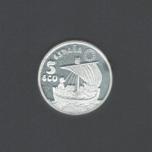 Made from silver, this coin has a proof finish, adding to its desirability for collectors. It is in uncirculated condition, ensuring that its original mint quality is preserved. With a denomination of 5 ECU, this coin represents a significant value and is a testament to Spain's rich maritime history.