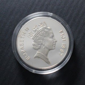 The coin features a beautifully engraved portrait of the Queen and Prince Philip on the obverse, surrounded by the words "Queen Elizabeth II and Prince Philip - 50 Years of Wedded Bliss." The reverse of the coin depicts the Fijian coat of arms, along with the denomination and the year of issue.