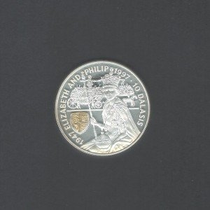 On the obverse side of the coin, there is a portrait of Queen Elizabeth II, along with the inscription "ELIZABETH II" and the date "1997." The reverse side of the coin features a portrait of Prince Philip alongside Queen Elizabeth II, with the words "Elizabeth & Philip" and "Golden Wedding" inscribed around them.