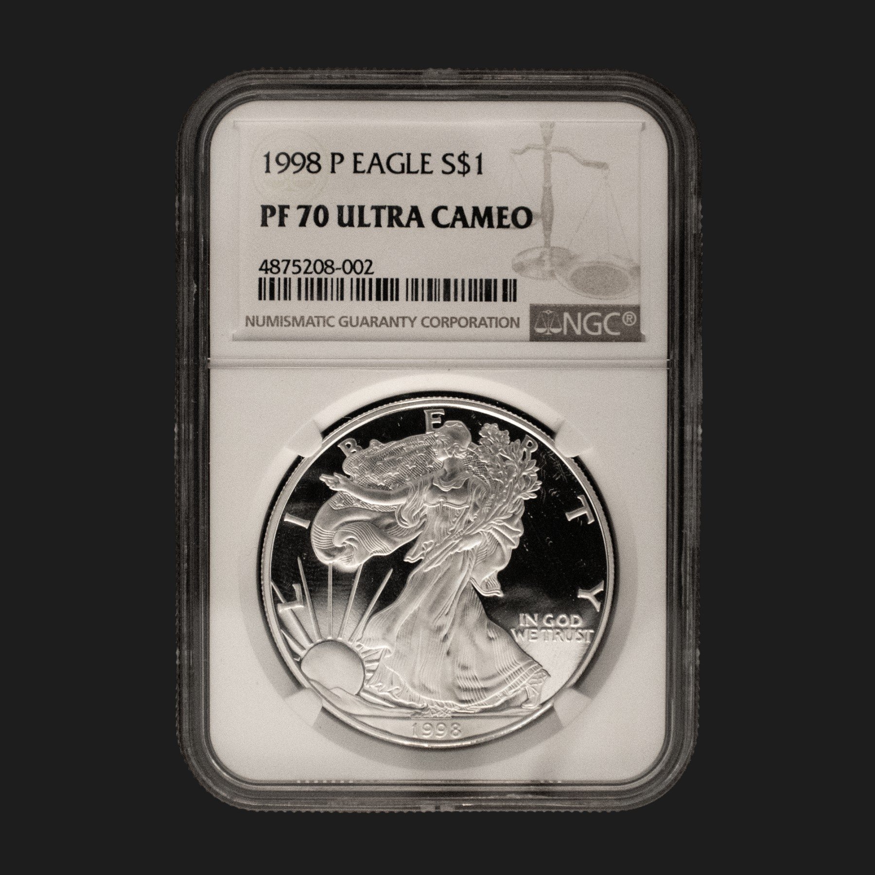 Certified by NGC, one of the most reputable coin certifiers in the industry, this 1998 American Silver Eagle Dollar has received a grade of PF70 / Ultra Cameo. This signifies that the coin is in perfect condition and exhibits exceptional quality and detail. Collectors will be pleased to add this flawless specimen to their collection, while investors can be confident of its long-term value.