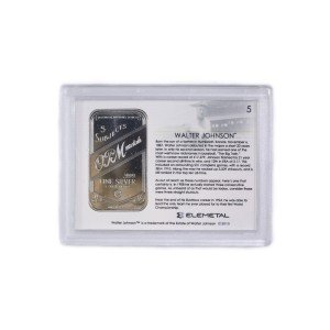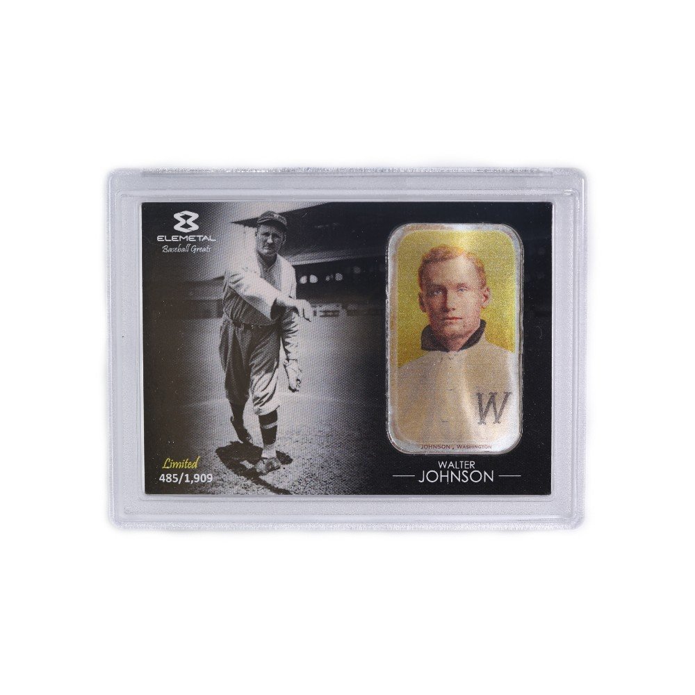 Introducing the 1oz Silver Bar T-206 Walter Johnson (Yellow Background) Baseball Greats Series #5, a must-have for collectors and sports enthusiasts alike. This stunning silver bar is designed after the legendary 1909 T-206 Tobacco card set, a true symbol of baseball history. With a limited mintage of only 1,909 pieces, this bar is a rare and exclusive find.