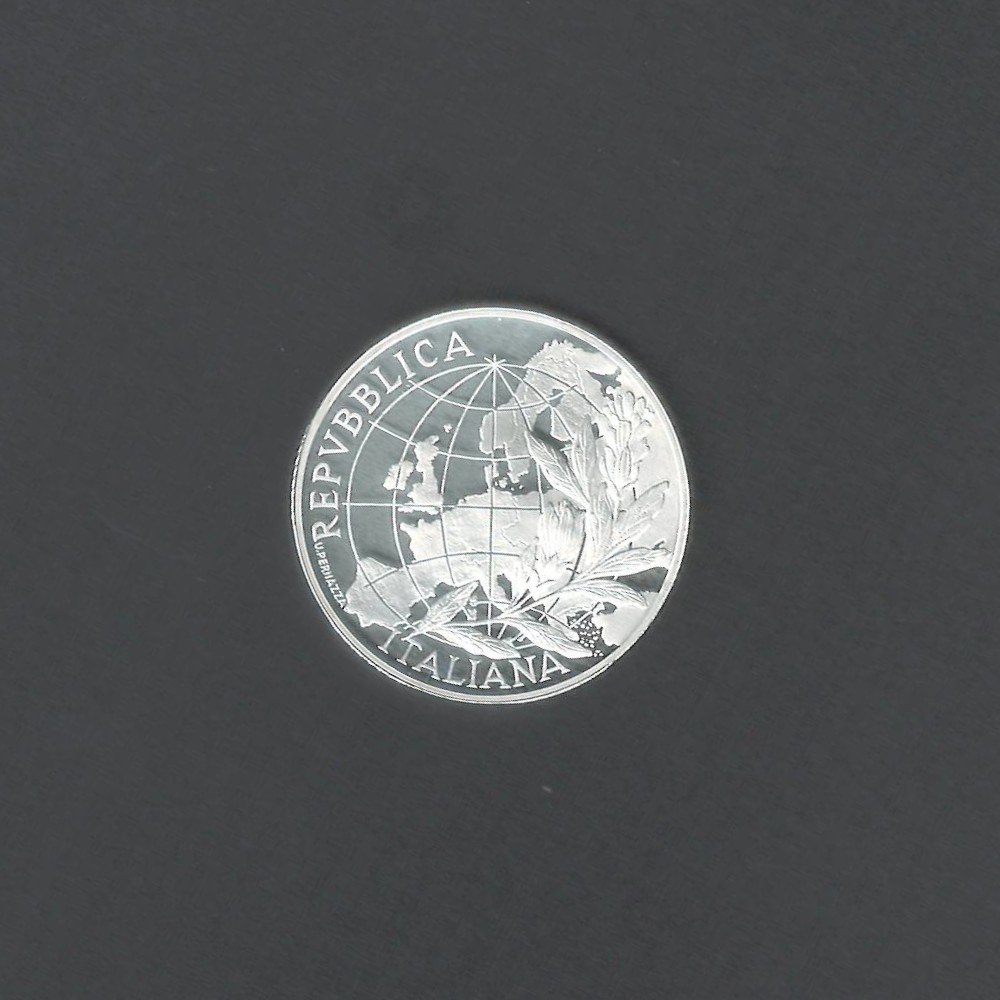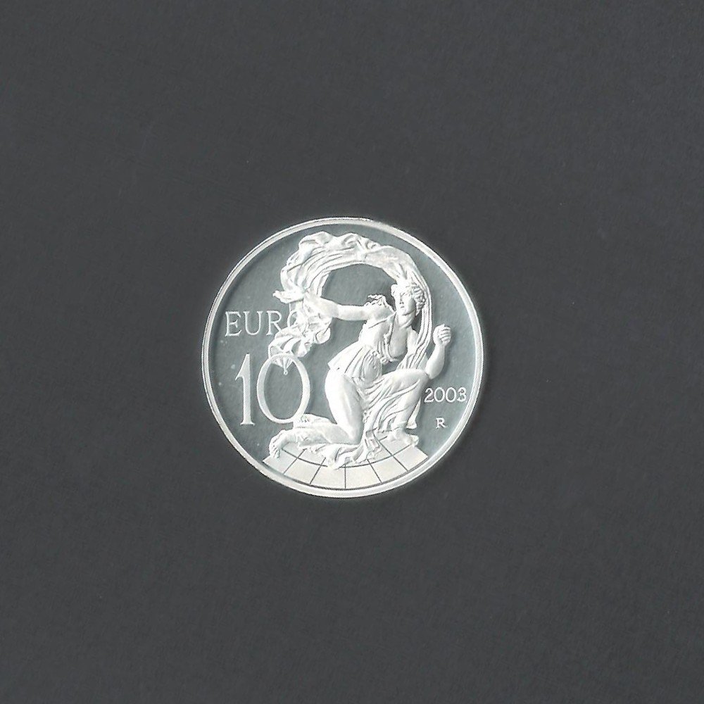 This coin is made of 925 sterling silver and has a weight of 22 grams. It has a diameter of 34 millimeters and a smooth edge. The obverse side showcases the face value "10 Euro" surrounded by laurel leaves, symbolizing victory and honor. The reverse side depicts the map of Europe with the inscription "ITALIA" below it, emphasizing the country's participation in the monetary union.