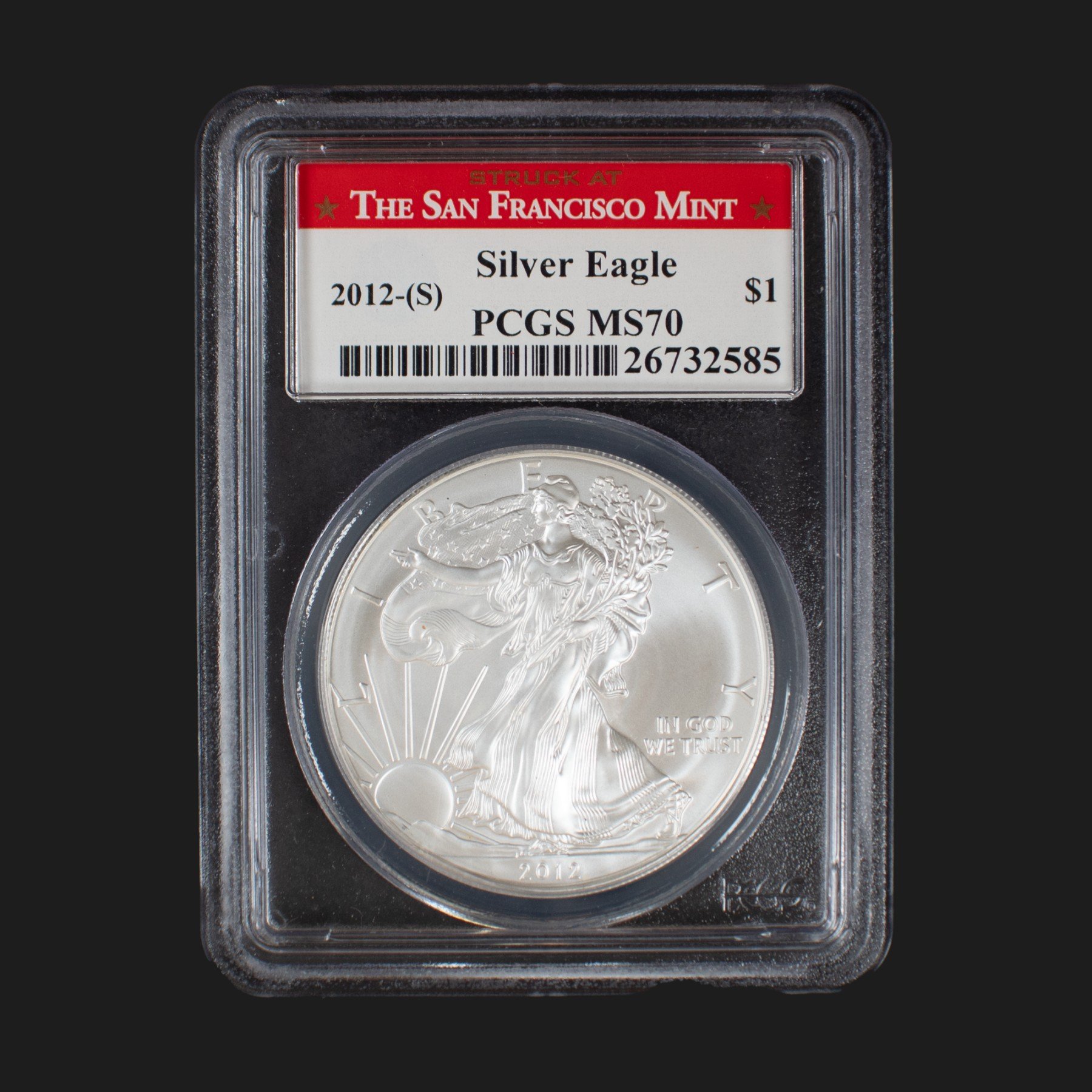 Introducing the 2012 $1 American Silver Eagle Dollar Silver MS70 Certified PCGS! This exquisite coin is a true masterpiece that is guaranteed to be a valuable addition to any collection. With a diameter of 40.6 mm, this one troy ounce silver coin showcases the exceptional craftsmanship of the US Mint / San Francisco.