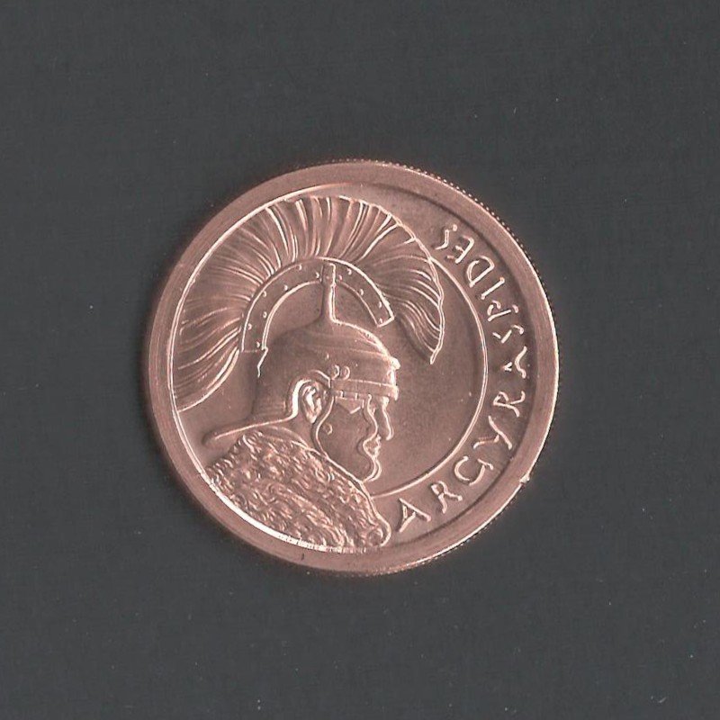The 2013 Golden State Mint Argyraspides Copper BU .999 United States Round is a stunning and unique collectible piece for any coin enthusiast. This round is crafted from pure copper and features a brilliant uncirculated finish. The obverse design depicts an intricate and detailed image of a soldier from the ancient Greek Argyraspides infantry, showcasing their renowned bravery and skill in battle.