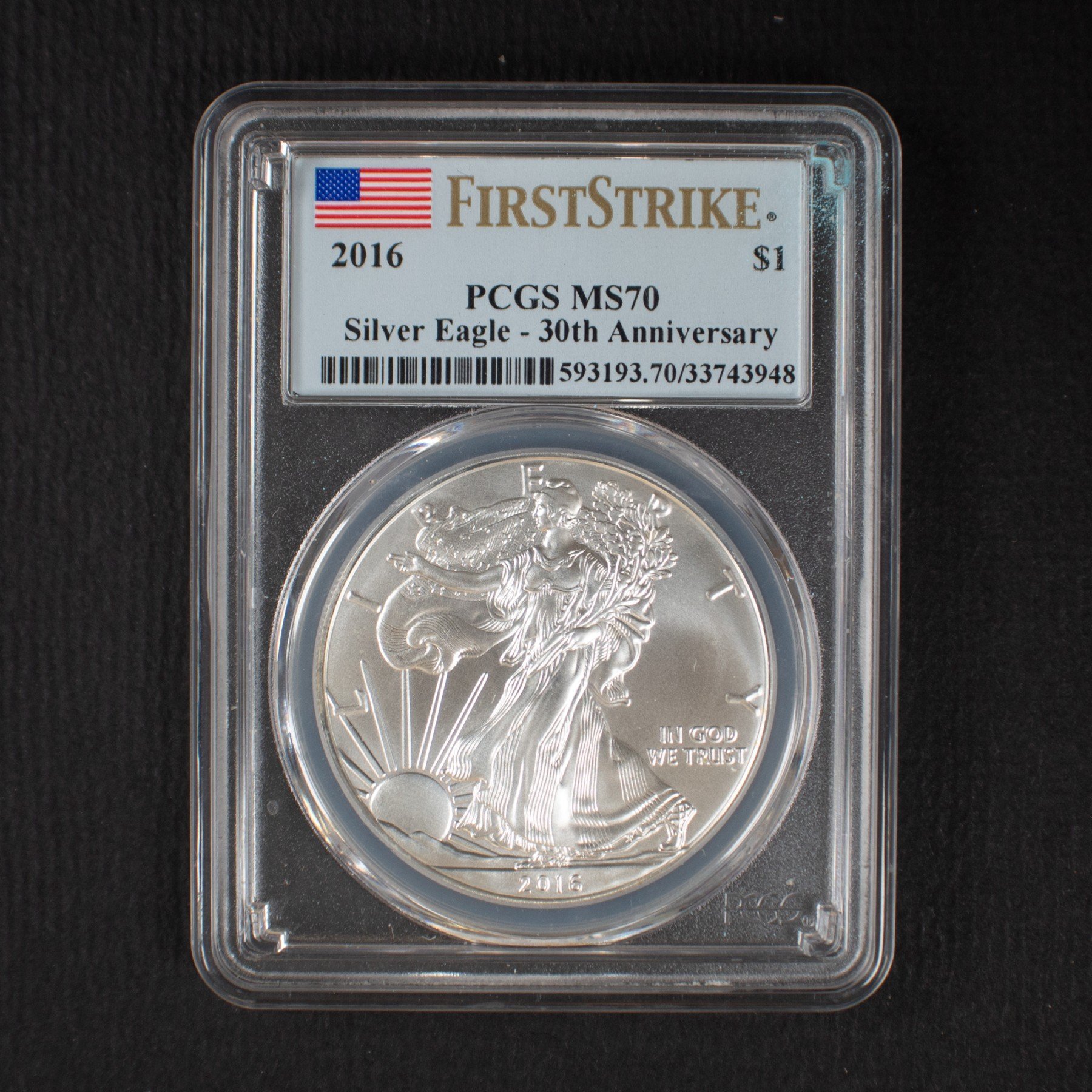Introducing the 2016 $1 American Silver Eagle Dollar! This stunning silver coin is a must-have for any collector or investor. Made of high-quality .999 fine silver, this coin is certified as MS70 by PCGS, ensuring its authenticity and quality.