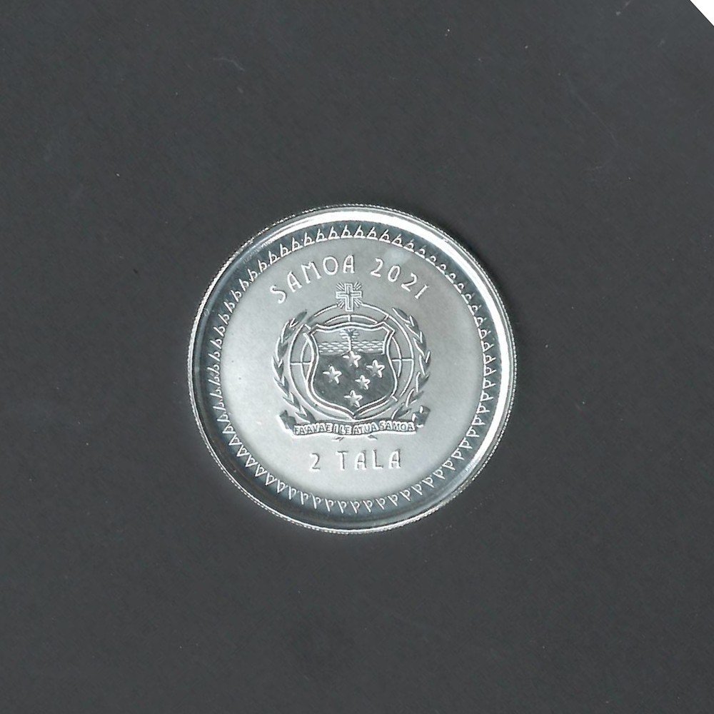 The reverse side of the coin features the coat of arms of Samoa, with the national motto "Fa'avae i le Atua Samoa" (Samoa is founded on God) inscribed in both English and Samoan. The coin's denomination of 2 Tala is also prominently displayed. The coin's obverse side showcases Her Majesty Queen Elizabeth II, the reigning monarch of Samoa, along with the year of issue, 2021.