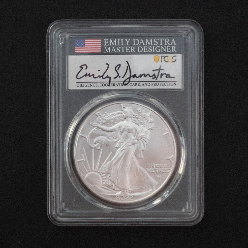 Designed by Emily Damstra, the American Silver Eagle Dollar First Strike showcases her incredible talent for capturing the beauty and majesty of American wildlife. The reverse of the coin features a heraldic eagle, while the obverse displays a stunning depiction of Lady Liberty. These iconic designs are sure to stand out in any collection.