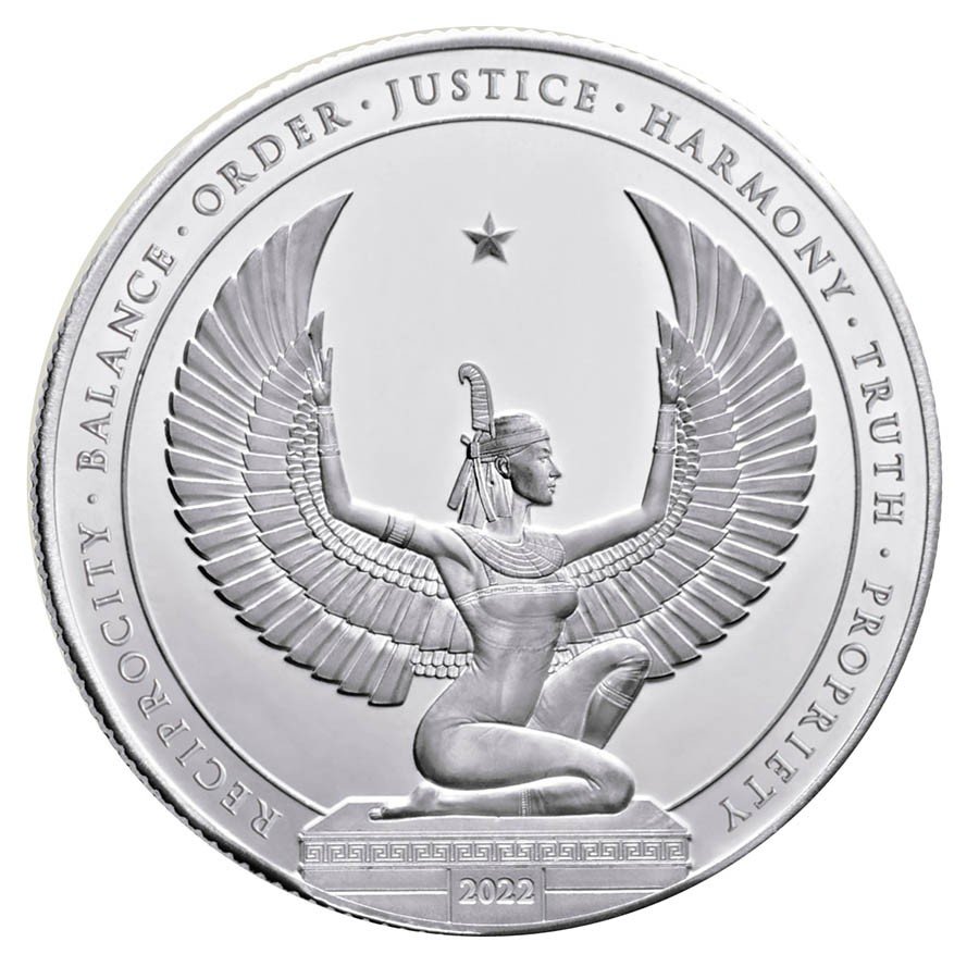 The 2022 Kinesis Egyptian Goddess B UNC .999 1oz Reeded 38 mm Round is an extraordinary addition to any collection. This coin is the first in the Kinesis Bullion series and features the Egyptian goddess Ma’at, symbolizing order, truth, harmony, and justice. The intricate design showcases Ma’at's kneeling posture with wings that encircle the curvature of the coin, representing her mythical control over the stars and cosmos. Crafted in-house with impeccable attention to detail, this silver bullion coin is a true testament to Kinesis' commitment to quality.