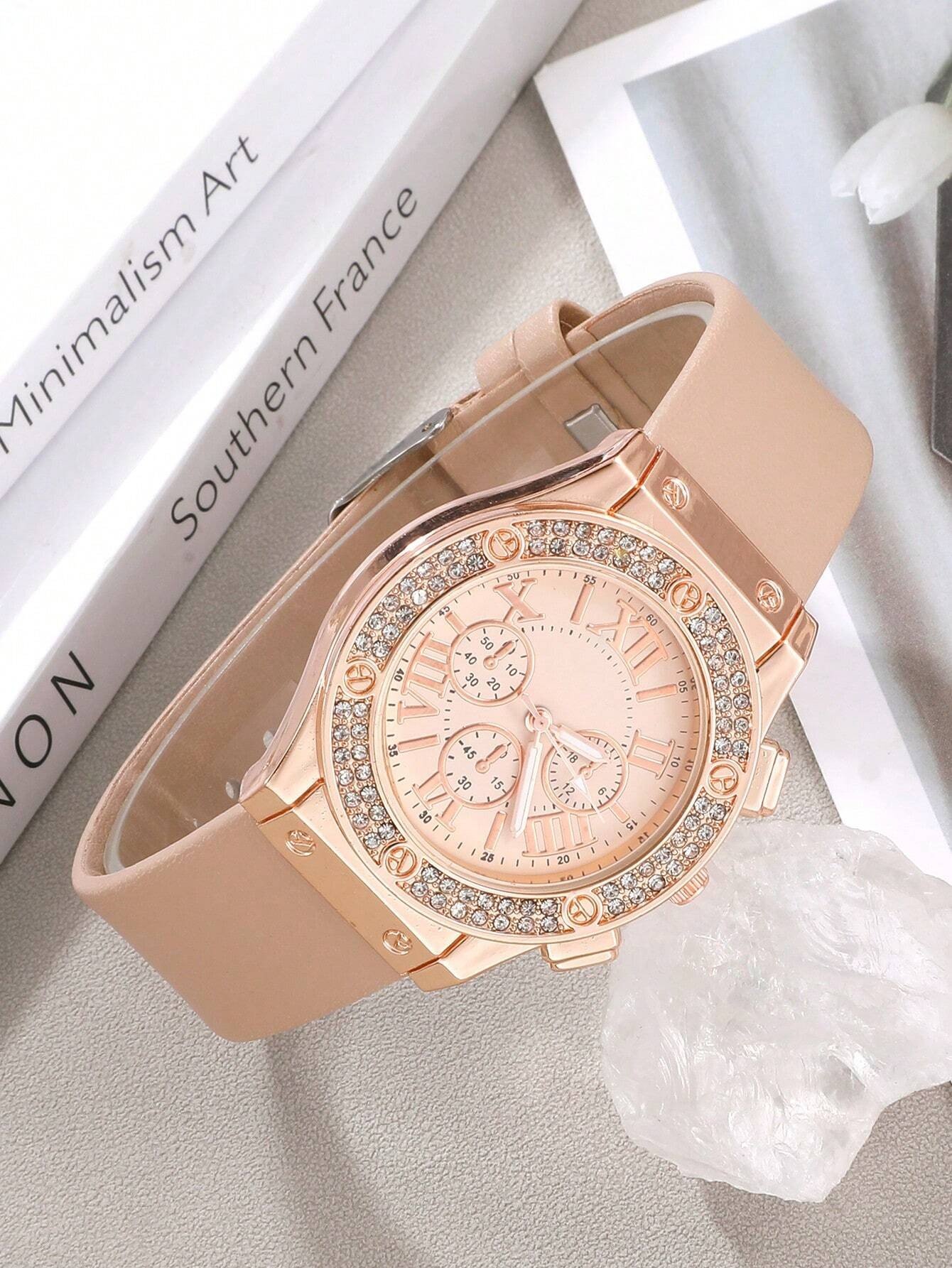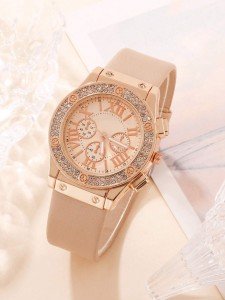 Featuring a round pointer quartz movement, this watch ensures accurate timekeeping. The glass rhinestone details around the dial add a hint of sparkle, making it a perfect accessory for any occasion. The one-size fit makes it suitable for all wrist sizes, and the beige color effortlessly complements any outfit. Whether you're heading to work, attending a special event, or simply running errands, this watch will effortlessly elevate your style.