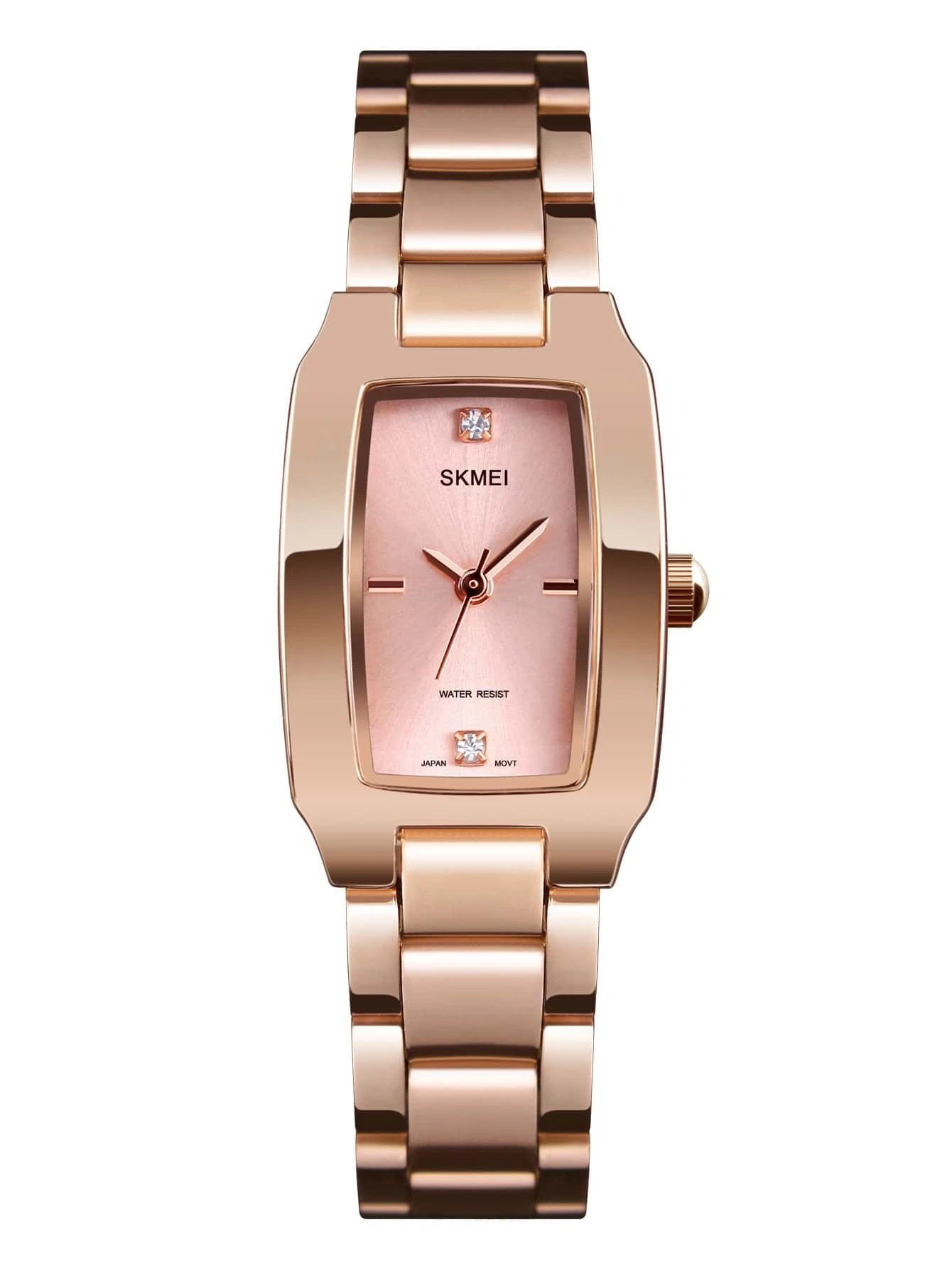 Introducing the Womens Zinc Alloy, Glass Square Pointer Quartz Watch in a stunning rose color. Crafted with care from high-quality zinc alloy and glass materials, this timepiece is not only stylish but also durable. Designed specifically for women, its one-size-fits-all strap ensures a comfortable and secure fit on any wrist.