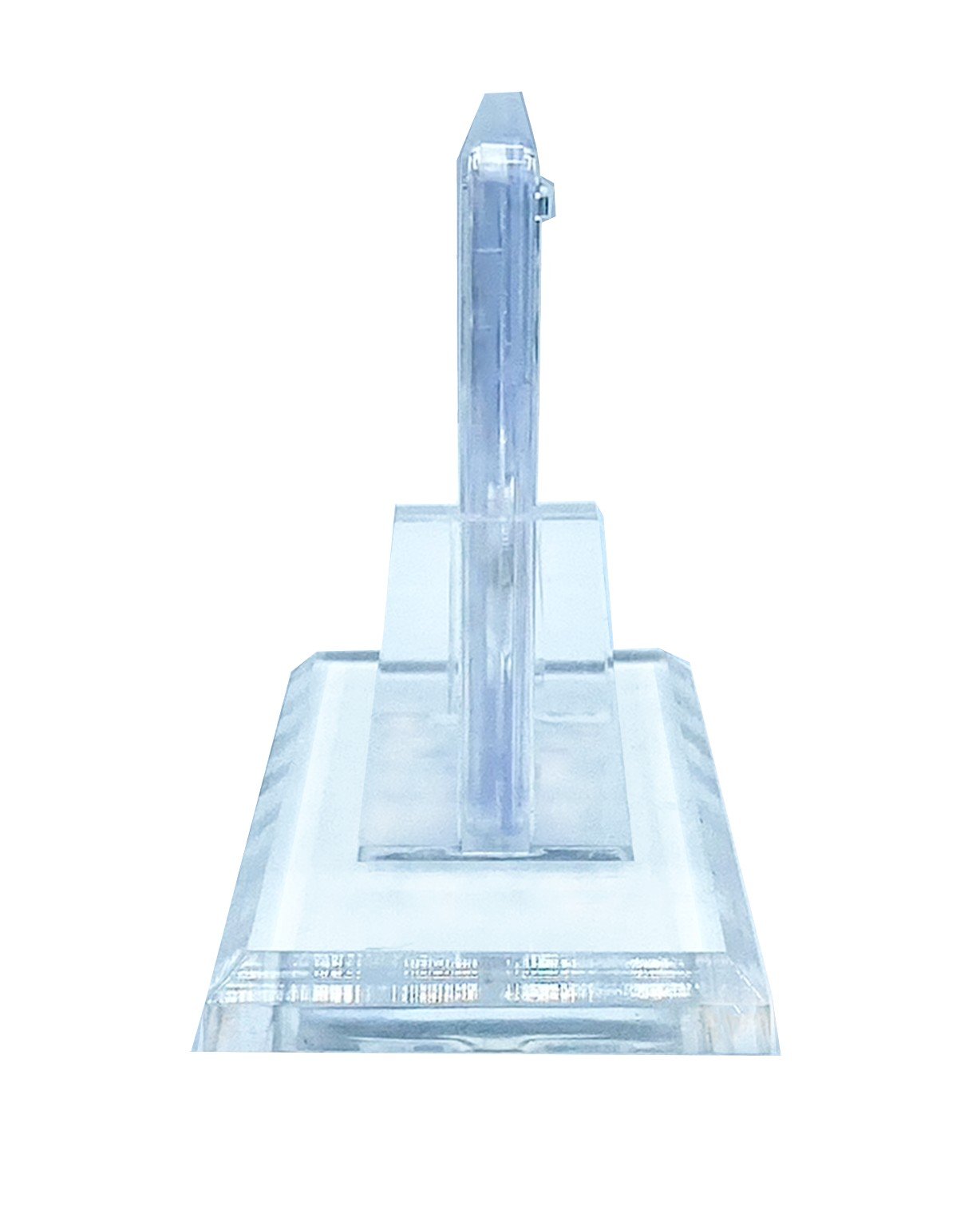 The stand features a clear design that allows for optimal visibility of both the front and back of the slab. It securely holds the slab in place, preventing it from sliding or falling out. The stand also has a slight slant, providing an optimal viewing angle for displaying your coins.