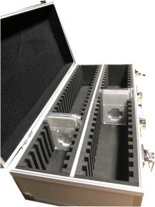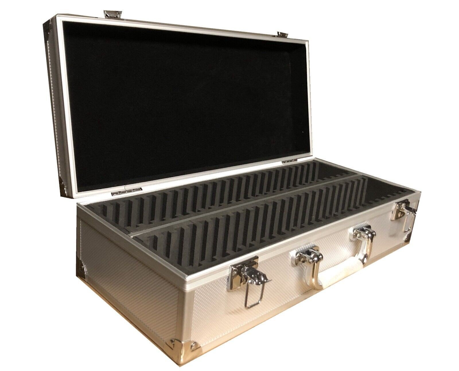 The box features a transparent lid that allows for easy viewing and display of the slabs. The slabs fit securely into individual slots within the case to prevent any movement or potential scratching. The compact size of the case makes it convenient for storage, and the snap-lock closure ensures that the slabs are securely held in place.