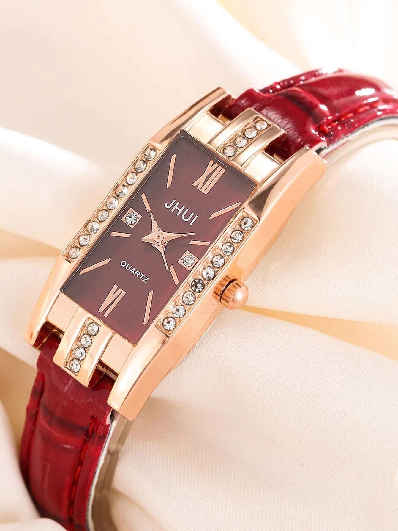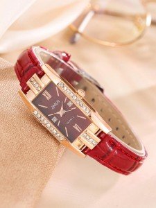 Introducing the Womens Zinc Alloy, PU Leather, Glass Rhinestone Rectangle Quartz Watch in a stunning shade of red. This exquisite timepiece is designed specifically with women in mind, combining both style and functionality seamlessly. Made from high-quality materials such as zinc alloy, PU leather, and glass, this watch is built to last.