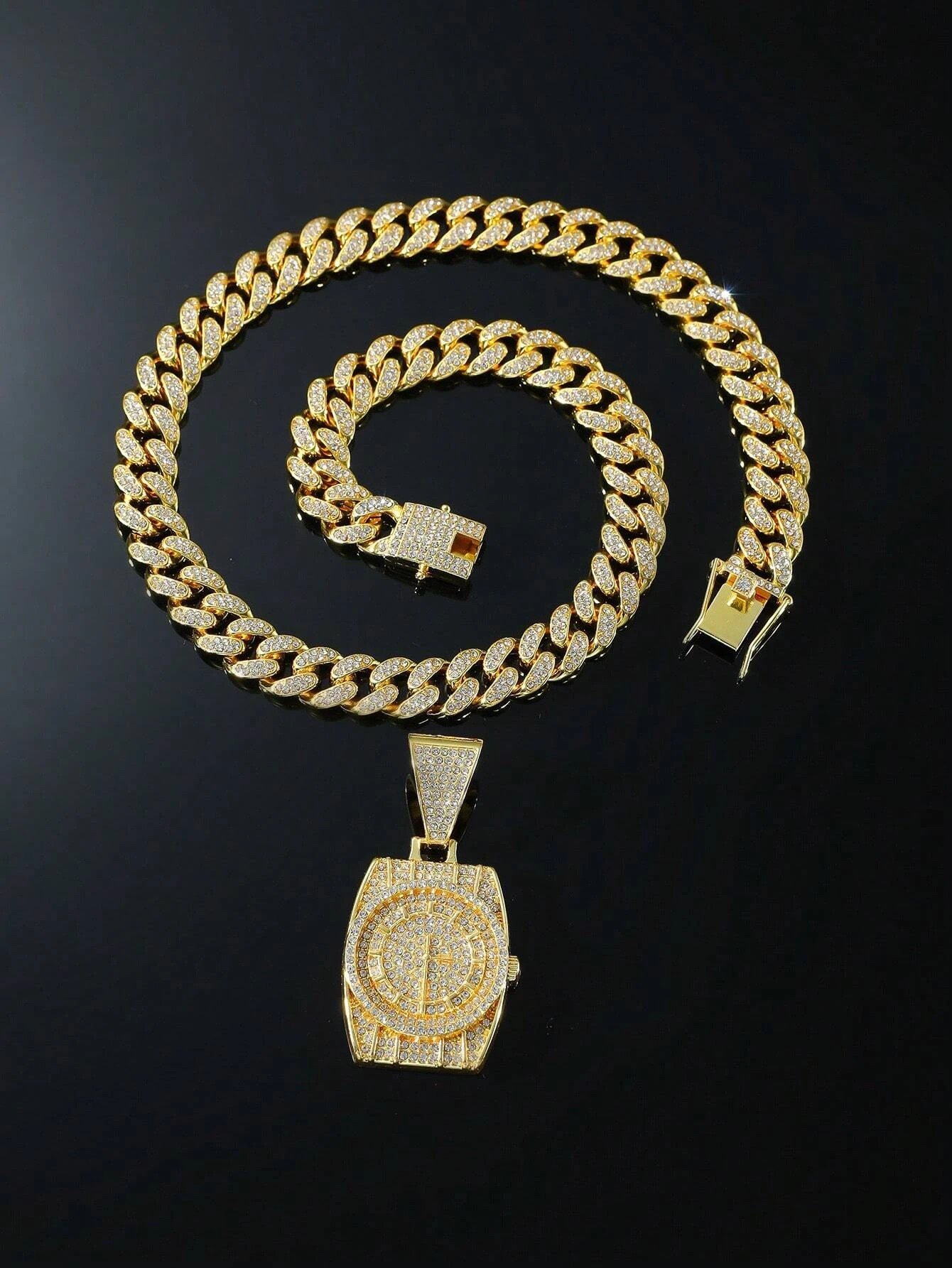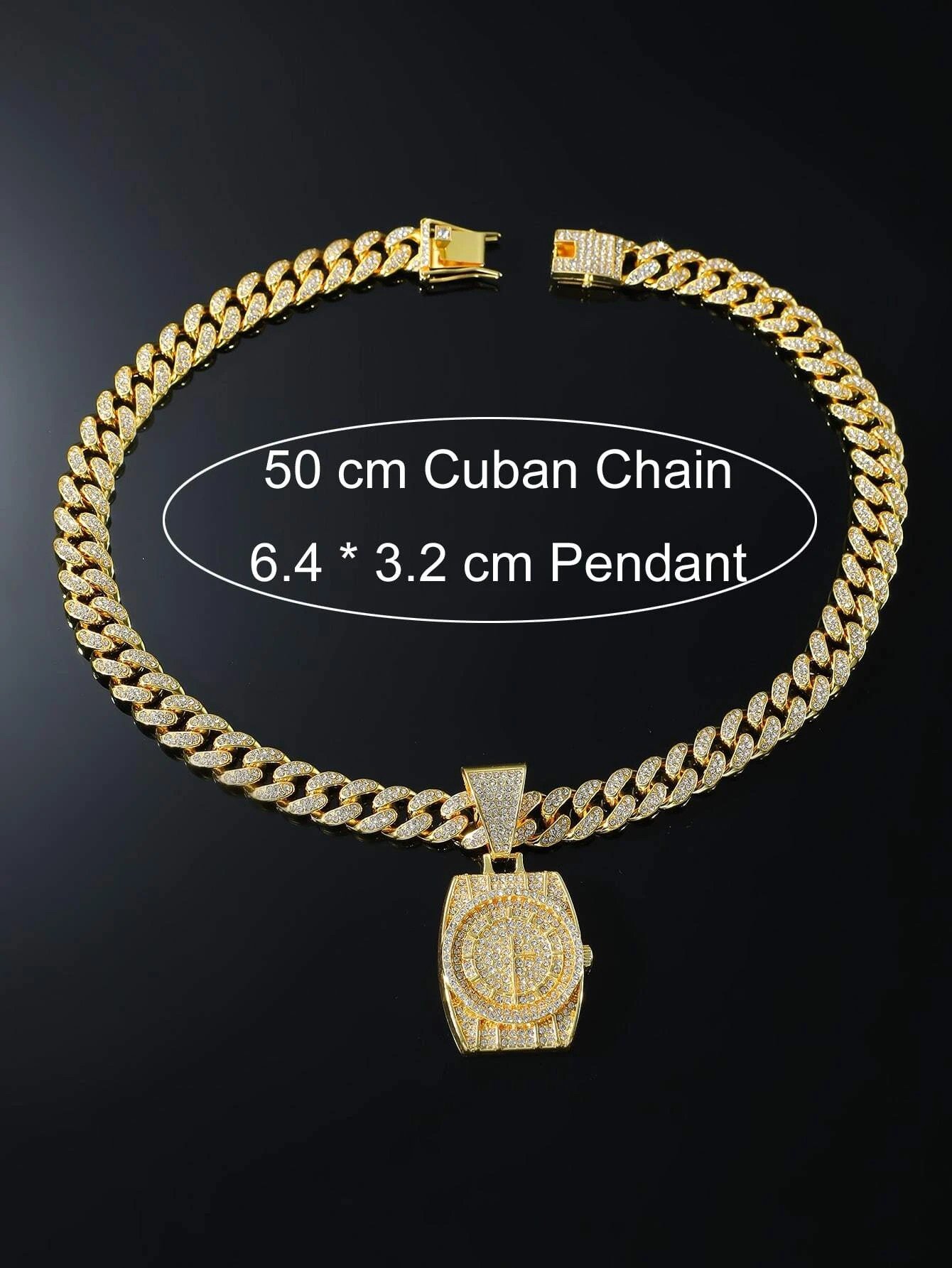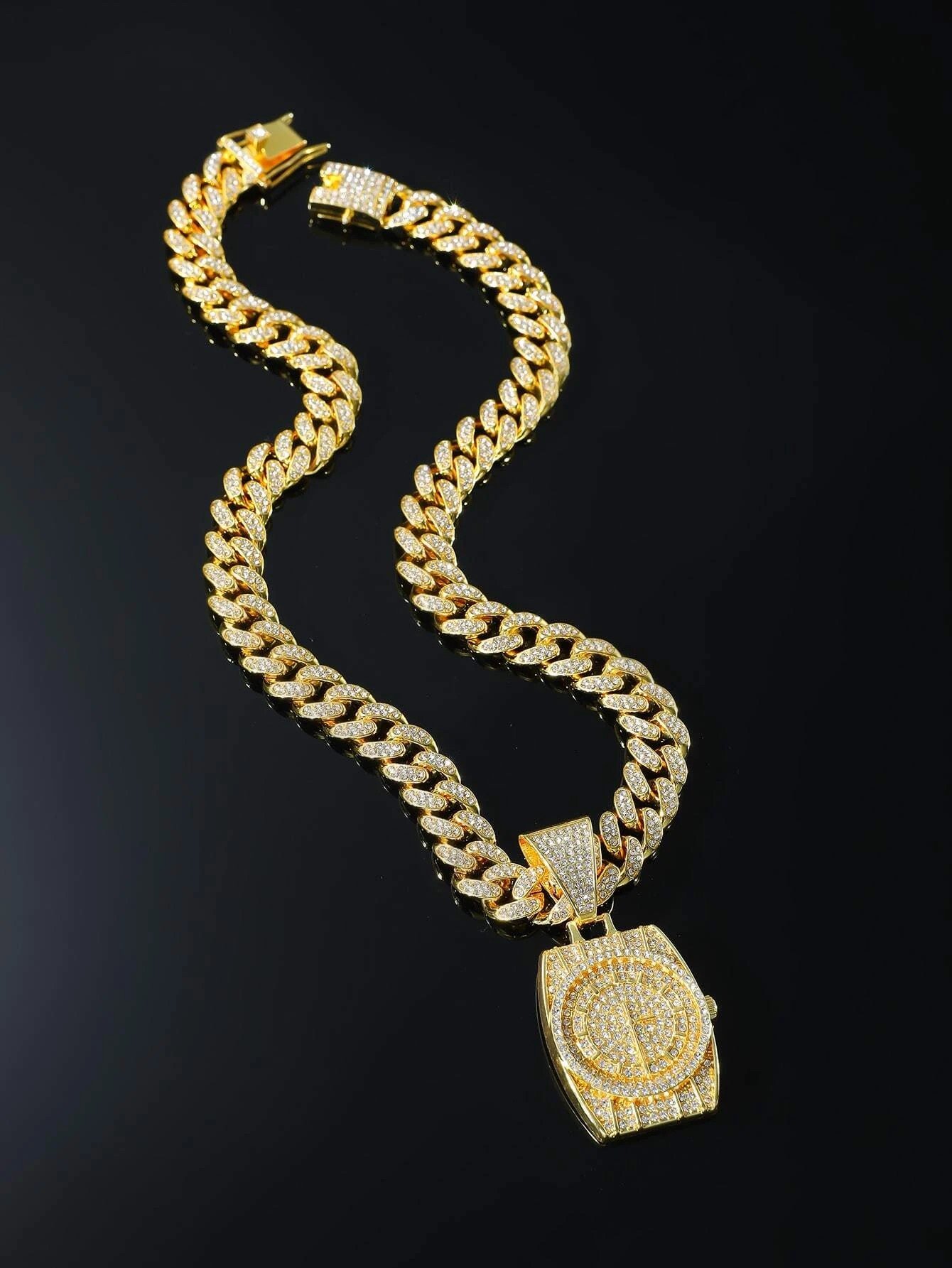 Introducing the Rhinestone Watch Pendant Necklace in a dazzling gold hue! This versatile piece is perfect for anyone looking to add some bling to their wardrobe. The rhinestone-studded watch pendant adds a touch of elegance, while the hip hop flair brings a fun and edgy vibe.