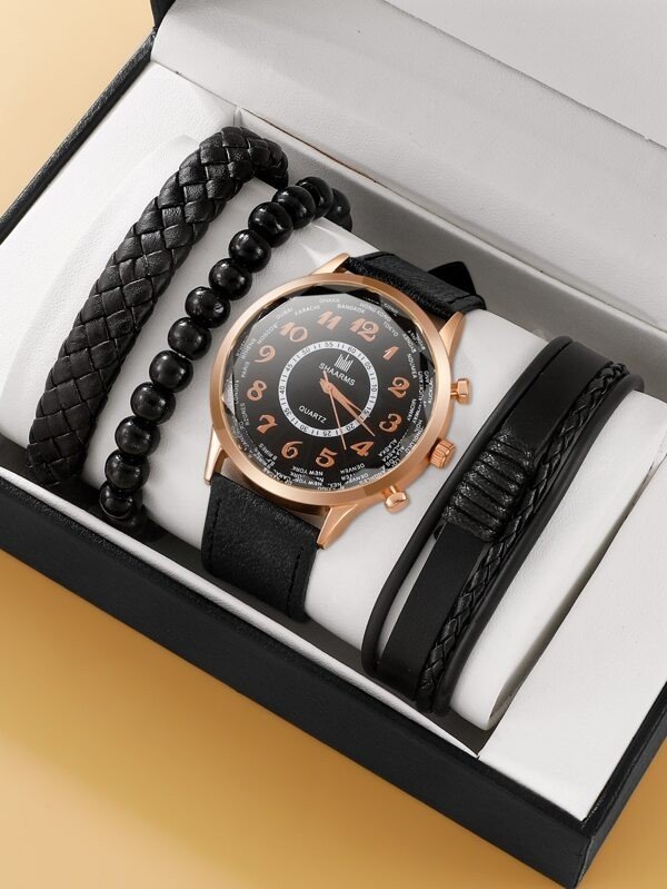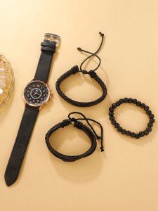 Investing in this Round Pointer Quartz Watch & 3 Bracelets is not only a smart fashion choice, but also a practical one. The quartz movement ensures accurate timekeeping, eliminating the need to constantly adjust or replace batteries. The sleek design and quality materials used in this watch make it a durable and long-lasting investment. Enhance your style and elevate your look with this stunning watch and bracelet set - a must-have for any modern man.