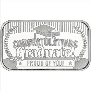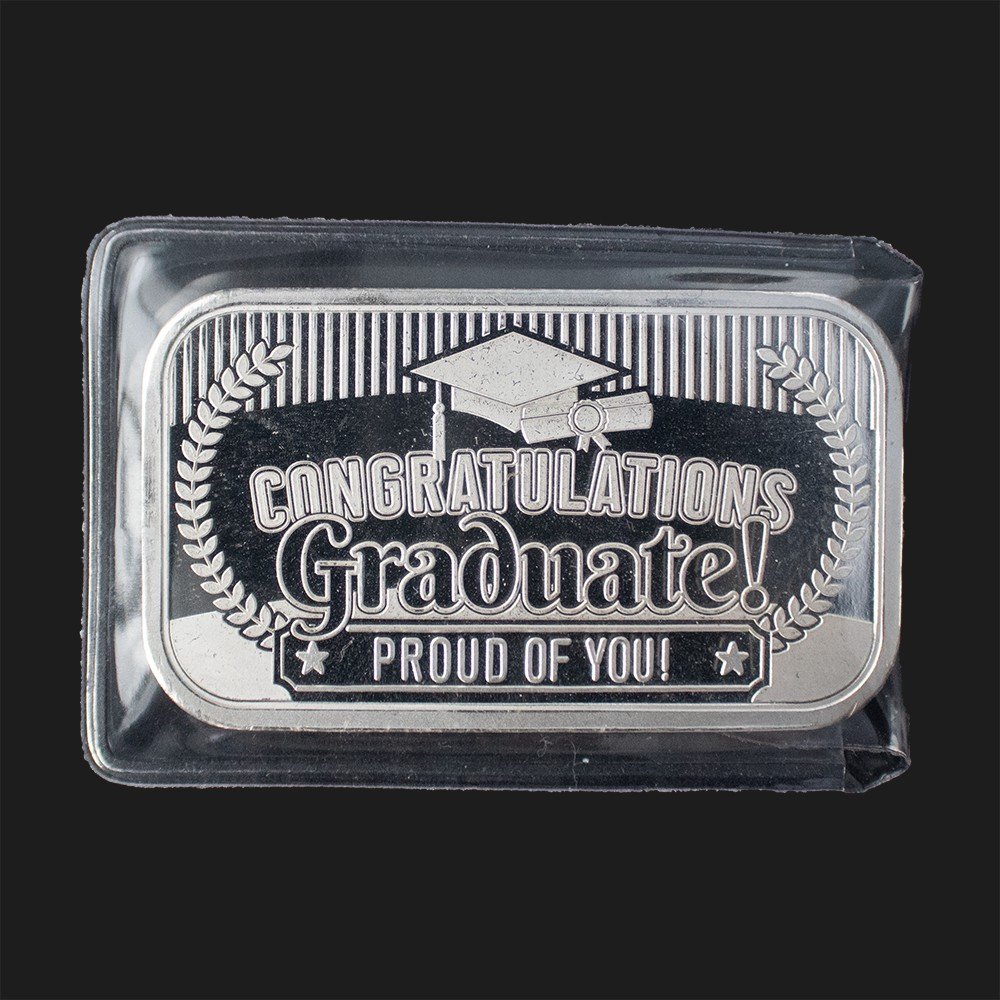 Celebrate the achievements of your favorite graduate with the stunning SilverTowne 1 Ounce Silver Congratulations Graduate! Design Bar. Made from high-quality .999 silver, this bar is not only a beautiful keepsake, but also a valuable investment. With a weight of 1 Troy Ounce, this bar is substantial and feels substantial in the hand.