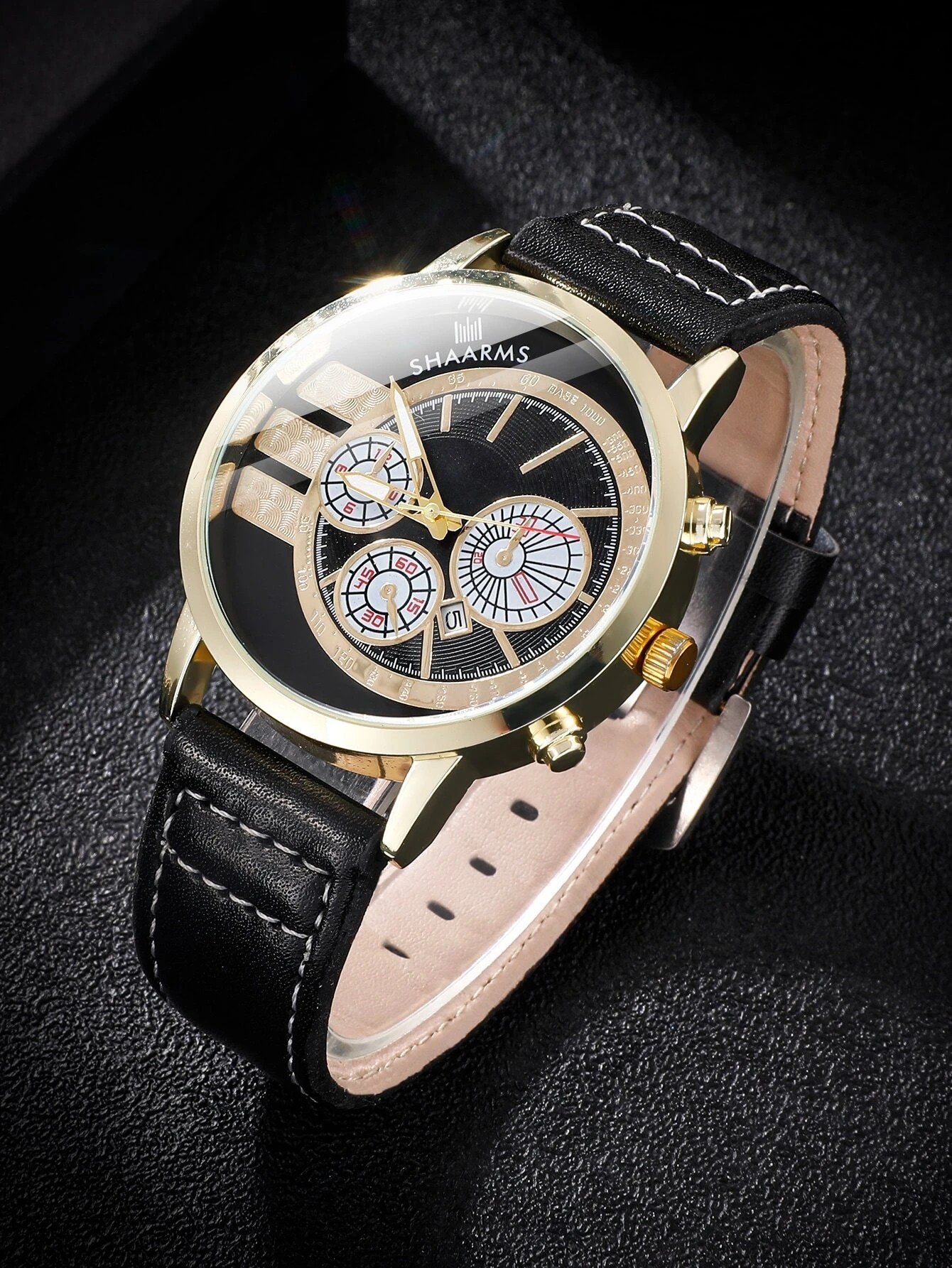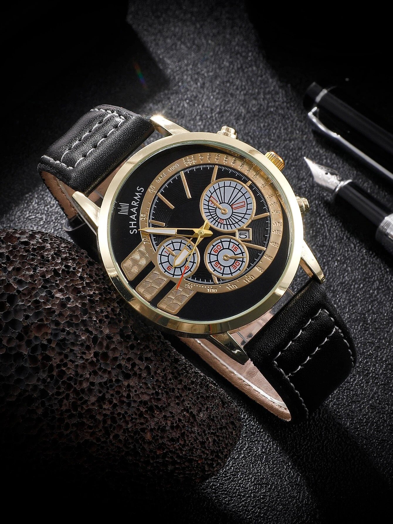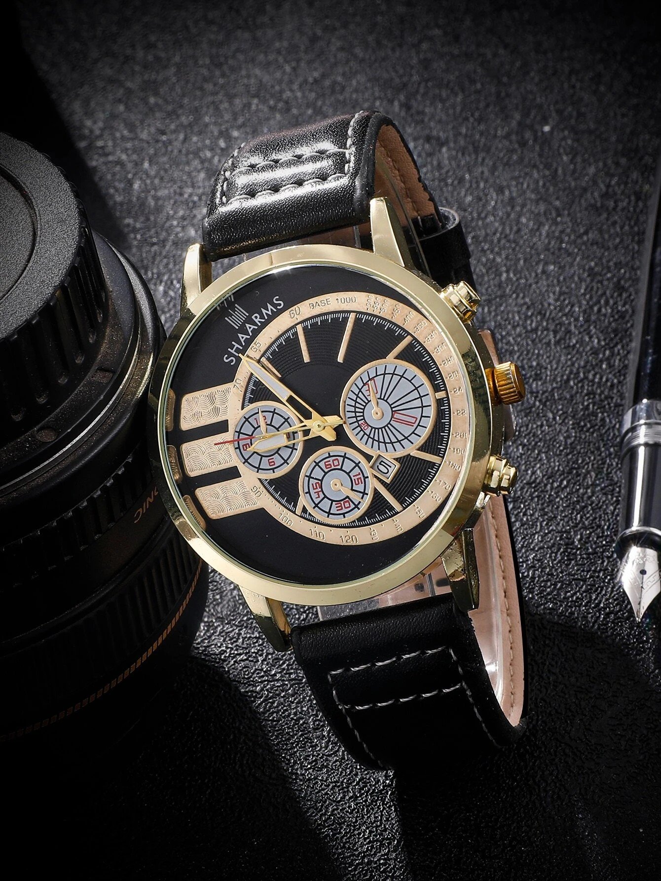 Designed specifically for men, this black and gold watch effortlessly blends style and functionality. Whether you're attending a formal event or going about your daily routine, this timepiece is sure to turn heads and add a touch of class to any outfit. Upgrade your accessory collection today with this Triple Dial Date Quartz Watch With Gold Bezel and experience the perfect blend of fashion and functionality.